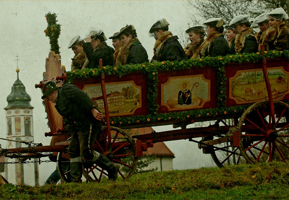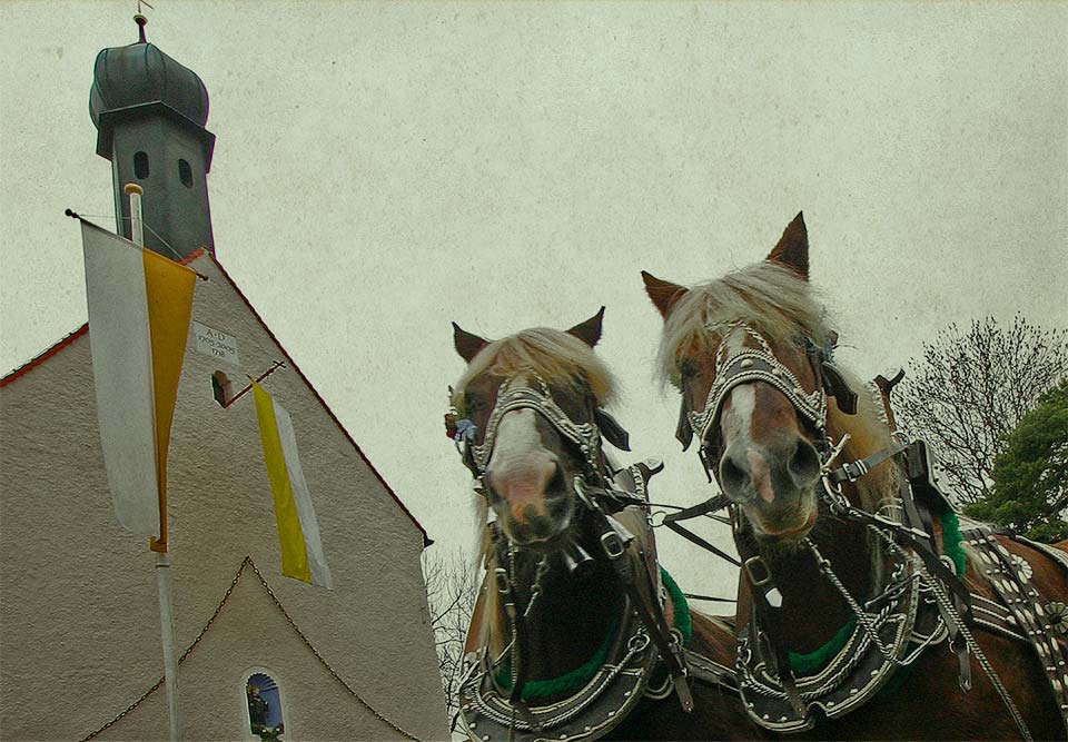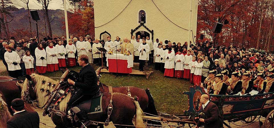 Am Kalvarienberg angekommen, umrunden die Fuhrwerke die Leonhardikapelle. Dort erhalten sie den Segen des Stadtpfarrers, um anschließend in geordneter Zugfolge auf dem großen Aufstellplatz dem Gottesdienst unter freiem Himmel zu folgen.